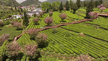 【映像】茶畑と桜が彩る春景色、茶摘みと花見の季節が到来 中国貴州省