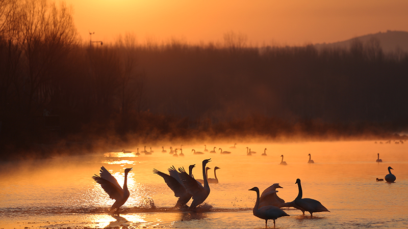 羽を休めるハクチョウの群れ 中国・遼寧省北票市