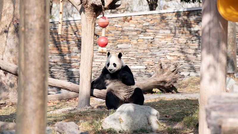 パンダの福宝、のんびり休憩 中国四川省