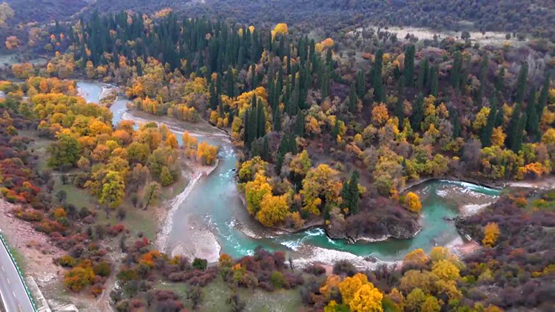 【映像】秋色に染まる果樹林 中国・新疆新源県