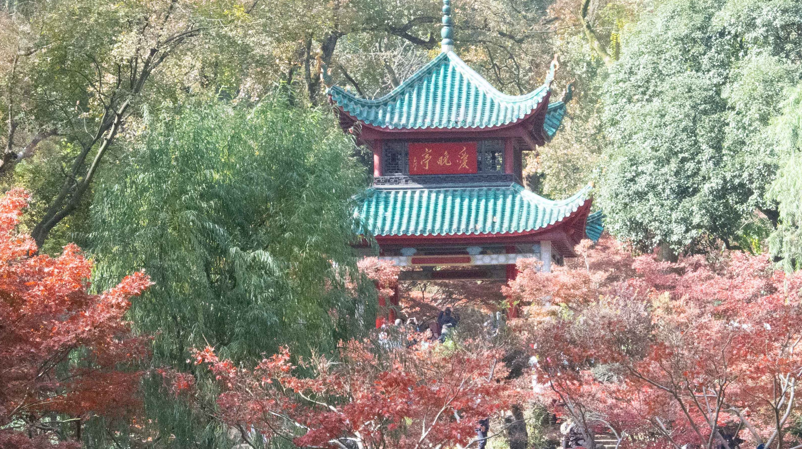 岳麓山の愛晩亭を彩る鮮やかなカエデ 中国・湖南省長沙市 2025-12-02