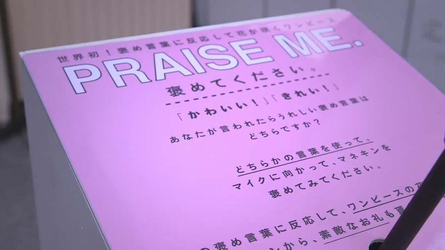 モデルは花のついたワンピースを着て街中に立ち、彼女の前には「褒めてください」と書かれた看板、隣りにはマイクが設置された。通行人がマイクに向かって「かわいい」、「きれい」と言うと、ワンピースについた花がゆっくりと開いた。通行人は喜び、多くの人が足を止めて褒め言葉を投げかけ、現場は多くの見物客が集まり賑わいだ。このモデルはプロのパントマイマーで、通行人から褒め言葉をかけられると花びらをふりかけてお礼した。