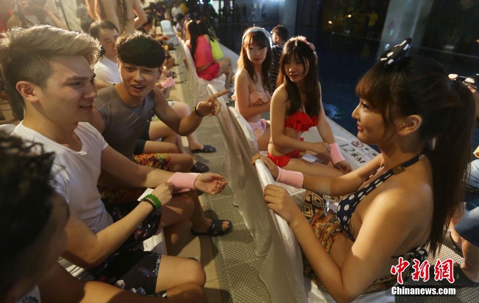 「单身汪を救う」をテーマとした見合いパーティーが8月19日、南京市のあるホテルのプールサイドで行われ、インターネットで応募した美男美女が参加した。