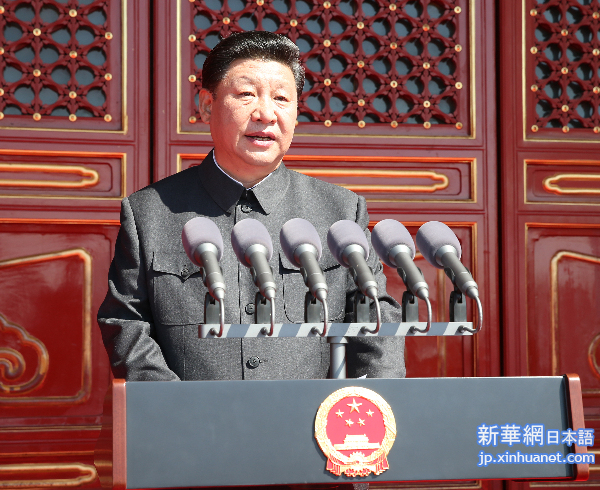 全国同胞の皆様、 尊敬する国家元首、政府首脳並びに国連をはじめとする国際組織の代表の皆様、 閲兵を受ける将校・兵士の皆様、 御来賓の皆様、同志の皆様、御友人の皆様、 本日は世界人民にとって永遠に記念すべき日です。70年前の今日、中国人民は14年間にわたる艱難辛苦な闘争を経て、中国人民抗日戦争の偉大なる勝利を収め、世界反ファシズム戦争の完全な勝利を宣言し、平和の陽射しが再び大地を照らすようになりました。 ここで、中国共産党中央、全人代、国務院、全国政治協商会議、中央軍事委員会を代表し、抗日戦争に参加した全国の元戦士、愛国人士と抗日将校の皆様に対し、中国人民抗日戦争の勝利のために多大な貢献をなされた国内外の中国人民に対し、崇高なる敬意を表したいと思います。中国人民が侵略に抵抗することを支援し助けてくれた外国政府と国際社会の友人の皆様に対し、衷心より感謝の意を表したいと思います。本日の大会に御出席される各国の御来賓と軍人の皆様に対し、衷心より歓迎の意を表したいと思います。 御来賓の皆様、同志の皆様、御友人の皆様、 中国人民抗日戦争と世界反ファシズム戦争は、正義と邪悪、光と闇、進歩と反動の大決戦です。あの惨烈な戦争において、中国人民抗日戦争は開始時期が最も早く、最も長く続いたものです。侵略者と向き合って、中華民族は不撓不屈で、血を浴びて戦い、日本軍国主義侵略者を徹底的に破り、中華民族の5000年あまりに及ぶ発展の文明の成果を守り、人類の平和を守り、戦争史上の奇跡と中華民族の壮挙を成し遂げました。 中国人民抗日戦争の勝利は、近代以来中国が外敵の侵略に抵抗し収めた初めての完全勝利です。この偉大なる勝利は、中国で植民支配を行うという日本軍国主義の企みを徹底的に粉砕して、近代以来中国が外部からの侵略への抵抗にたびたび失敗したという民族の屈辱をすすぎました。この偉大なる勝利により、世界における中国の大国としての地位が改めて固められ、中国人民も平和を愛する世界人民からの尊敬を得られました。この偉大なる勝利は、中華民族の偉大なる復興の明るい未来を開き、古き中国が生き返る新たな道のりをスタートさせました。 あの戦争において、中国人民は大きな民族犠牲を払って世界反ファシズム戦争の東方主戦場を支え、世界反ファシズム戦争の勝利のために大きな貢献をしました。中国人民抗日戦争もまた国際社会から幅広く御支持を頂きました。中国人民は各国の人民が中国抗日戦争の勝利のためになされた御貢献を永遠に銘記いたします。 御来賓の皆様、同志の皆様、御友人の皆様、 戦争を経験した人間こそ、平和の尊さをより一層理解できます。我々が中国人民抗日戦争並びに世界反ファシズム戦争勝利70周年を記念する目的は、まさに歴史を銘記し、烈士たちのことを思い偲び、平和を大切にして、未来を切り開くことです。 あの戦争はアジア、欧州、アフリカ、大洋州に戦火を及ぼし、軍民の死傷者は1億人も超え、そのうち中国の死傷者は3500万人、ソ連の犠牲者は2700万人を上回りました。歴史の悲劇を決して繰り返させないことは、かつて人類の自由、正義、平和を守るために犠牲になった英霊たちや、悲惨に虐殺された罪なき御霊への最もよい記念になります。 戦争は鏡のように、平和の尊さをより一層認識させてくれます。今日、平和と発展はすでに時代の流れとなっているが、世界は未だに太平とは言えず、戦争というダモクレスの剣は未だに人類の頭上に吊るされています。我々は歴史を鑑にして、平和を守る決意を固める必要があります。 平和のために、人類運命共同体意識をしっかりと樹立しなければなりません。偏見や差別、恨みや戦争は災難と苦痛しかもたらしてくれません。相互尊重、平等共存、平和発展、共同繁栄こそ世間の正しい道です。世界各国は国連憲章の宗旨と原則を中核とする国際秩序と国際体系を共に守り、協力とウィンウィンを中核とする新しいタイプの国際関係を積極的に構築し、世界の平和と発展という崇高なる事業を共に推進していく必要があります。 平和のために、中国は終始平和発展の道を堅持してまいります。中華民族は従来平和を愛しています。どこまで発展を遂げても、中国は永遠に覇を称えず、永遠に拡張を行わず、自分がかつて経験した悲惨な遭遇を他の民族に押しつけるようなことは決していたしません。中国人民は世界各国人民との友好的な付き合い、中国人民抗日戦争並びに世界反ファシズム戦争勝利の成果を断固として守り、人類のために新たにより大きな貢献していくよう勤めてまいります。 中国人民解放軍は人民からなる軍隊で、全軍の将士は全身全霊に人民に奉仕するという根本的な宗旨を心に刻み、祖国の安全と人民の平和な生活を守るという神聖なる職責を忠実に全うし、世界平和を守るという神聖なる使命を忠実に遂行しなければなりません。 ここで、中国は兵力の定員を