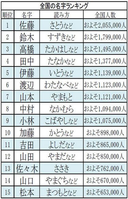 2015年3月26日、リクルーティングスタジオは 「全国 都道府県別名字ランキングベスト3500」を発表。全国で最も多い名字は、「佐藤」だった。藤原秀郷の末裔、左衛門尉公清が佐藤を称するに始まったとされている。また、家族が藤原氏のように公家を担い、繁栄するようにとの願いが込められているのではとの見方もある。2位は「鈴木」だった。鈴木は、紀伊国熊野の豪族である「穂積」姓がルーツではないかとされている。