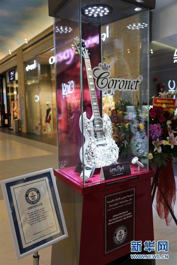 ギネス世界記録に認定された「世界一高価なギター」が5月22日、アラブ首長国連邦ドバイのショッピングセンターに展示された。