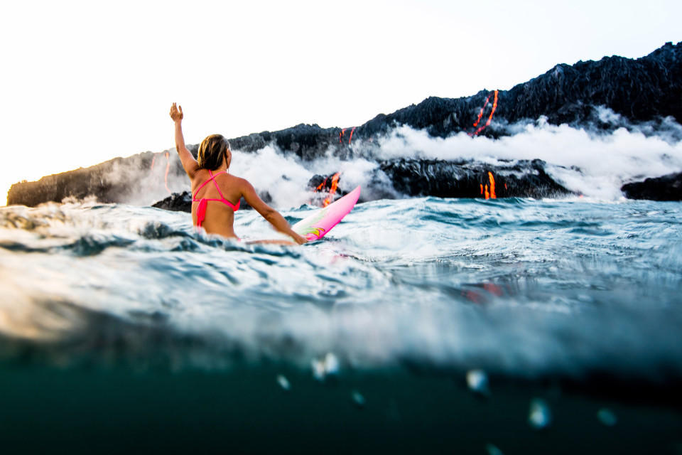 氷と火、美人がビキニを着て火山付近でサーフィン
