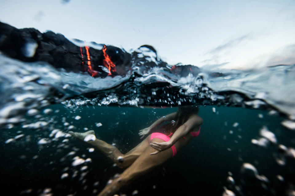 氷と火、美人がビキニを着て火山付近でサーフィン