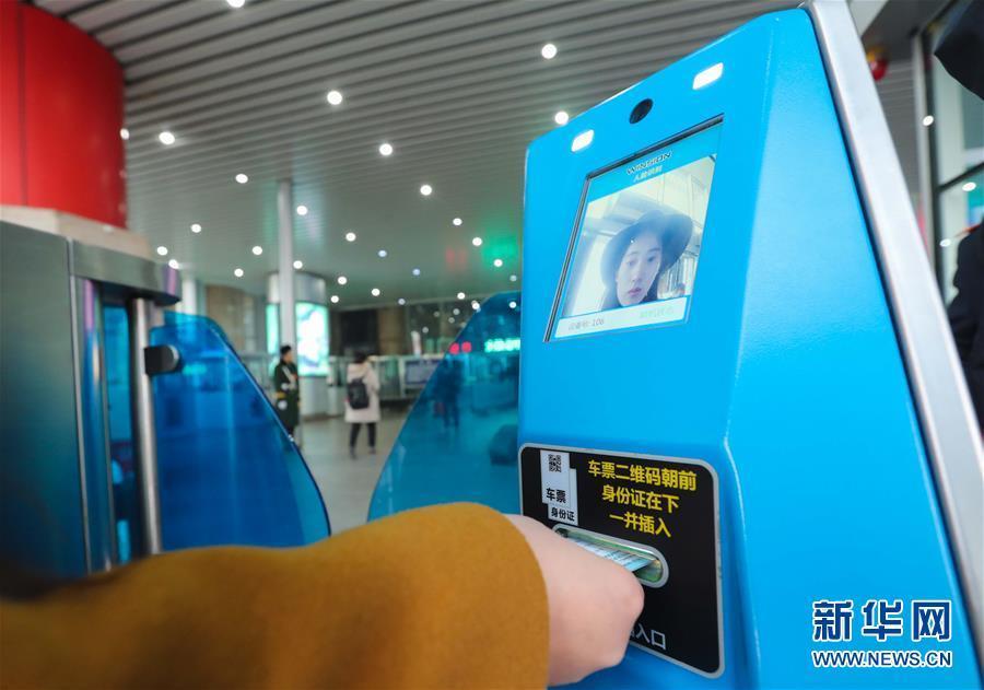 1月17日、顔認証システムを使い北京西駅に入る旅行客。2016年2月、北京西駅は一部の入口に自動で身分証と乗車券を検査するシステムを導入した。乗客は乗車券と身分証を持ち、顔認識システムを使い駅に入ることができる。このシステムは身分証と乗車券の検査の効率を上げ、2017年の春節帰省ラッシュに役立つ。