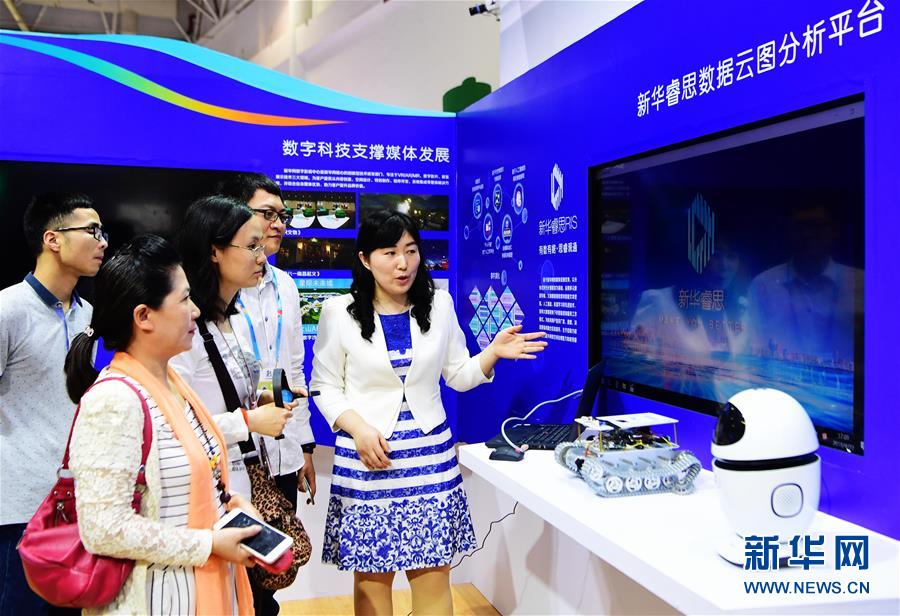 22日、第1回デジタル中国建設成果展で来場者に新華睿思タグクラウド分析プラットフォームを説明する新華網の社員。