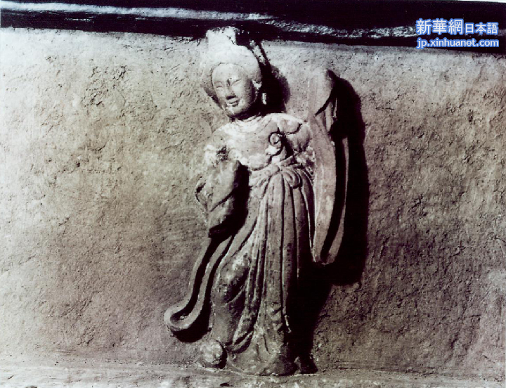 成都永陵の棺の台座に施されたレリーフ「永陵二十四伎楽」の一つ、踊り子。(1964年撮影)(成都=新華社配信/成都永陵博物館提供。
