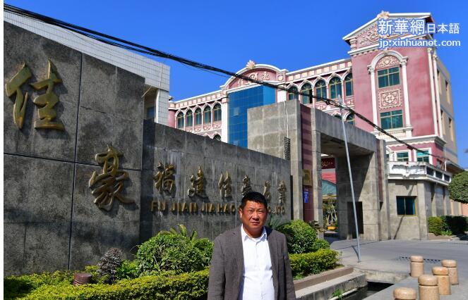 17日、記念撮影する福建佳豪集団の孫暁強(そん・ぎょうきょう)董事長。(福州=新華社記者/魏培全)