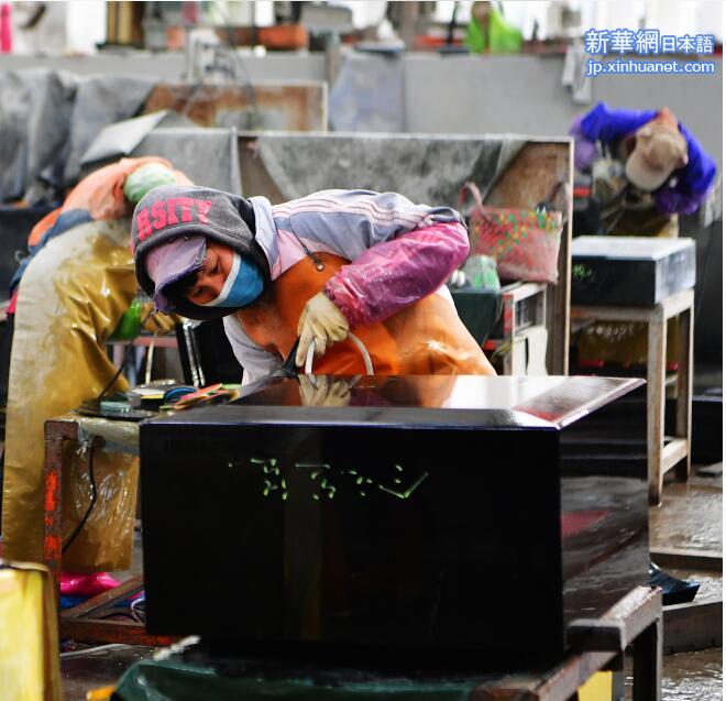 17日、恵安県崇武(そうぶ)鎮にある石材加工工場で、御影石の墓石台座を磨く作業員。(福州=新華社記者/魏培全)