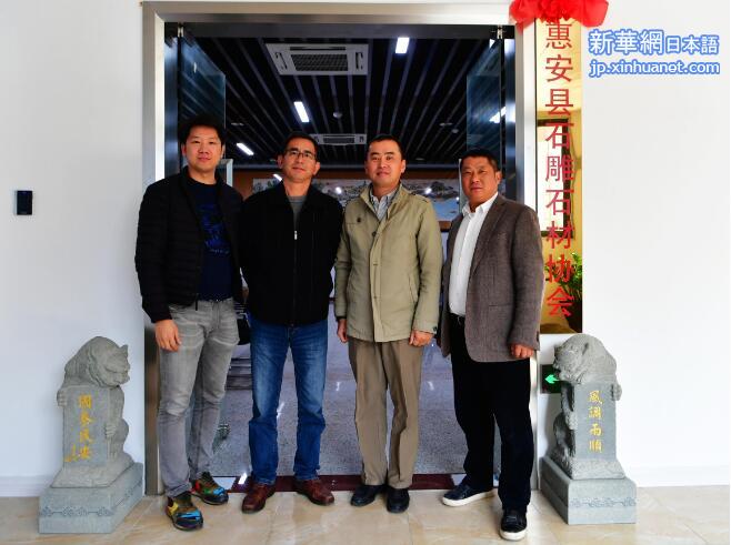 17日、恵安県石雕石材協会で記念撮影する福建佳豪集団の孫暁強(そん・ぎょうきょう)董事長(右から1人目)、泉州有志石材有限公司の総経理・恵安県石彫石材協会の王志剛(おう・しごう)会長(右から2人目)、恵安石材県石彫石材協会の肖祥楷(しょう・しょうかい)秘書長(左から1人目)および恵安県恩民石業有限公司の汪得奇(おう・とくき)董事長(左から2人目)。(福州=新華社記者/魏培全)