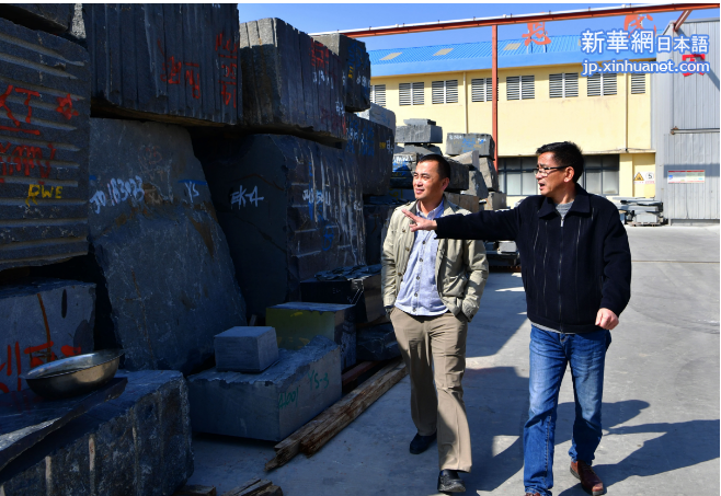 17日、石材の買い付けについて話し合う泉州有志石材有限公司の総経理・恵安県石彫石材協会の王志剛(おう・しごう)会長と恵安県恩民石業有限公司の汪得奇(おう・とくき)董事長。(福州=新華社記者/魏培全)