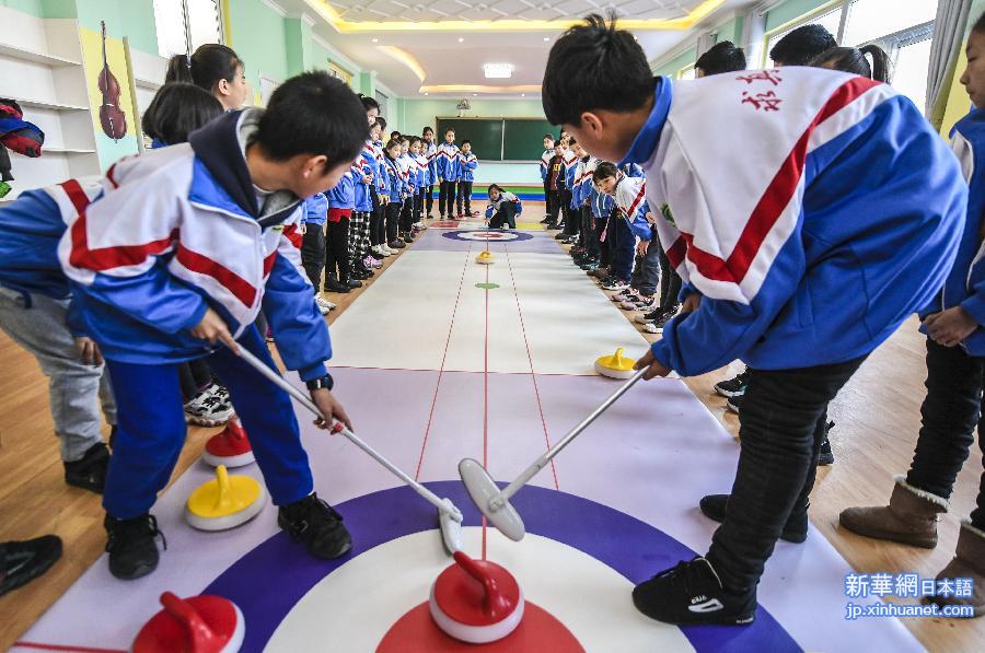 17日、フロアカーリングを練習する永清県第三小学校のチーム。(永清=新華社記者/李暁果)