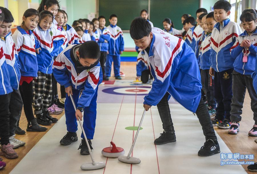 17日、フロアカーリングを練習する永清県第三小学校のチーム。(永清=新華社記者/李暁果)