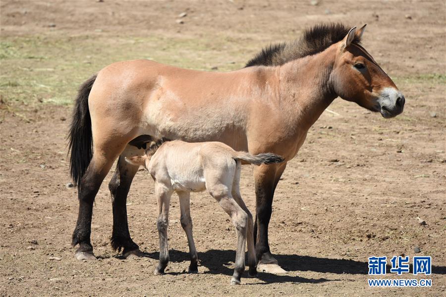 2日、新疆ウイグル自治区のモウコノウマ繁殖研究センターで、母馬の乳を飲む生後1カ月に満たない子馬。(ウルムチ=新華社記者/丁磊)