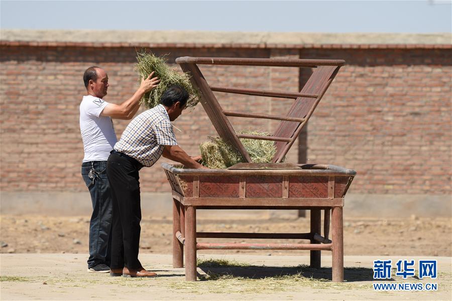 2日、新疆ウイグル自治区のモウコノウマ繁殖研究センターで、飼い葉の準備をする職員。(ウルムチ=新華社記者/丁磊)