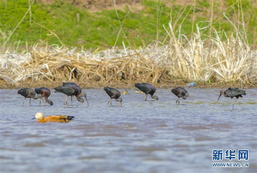 1日、剣湖湿地で餌をついばむブロンズトキ。(昆明=新華社配信)