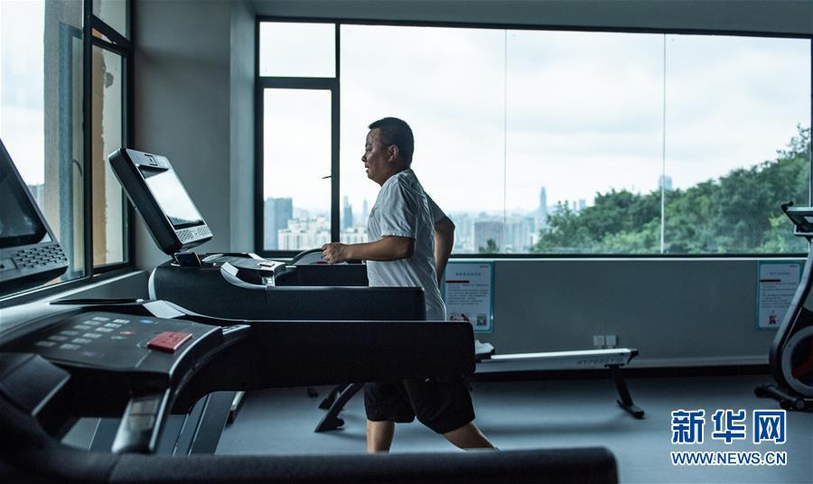 11日、貴陽市雲岩区小石城磐城小区のスマート市民フィットネスクラブにあるランニングマシンで走る住民。(貴陽=新華社記者/陶亮)