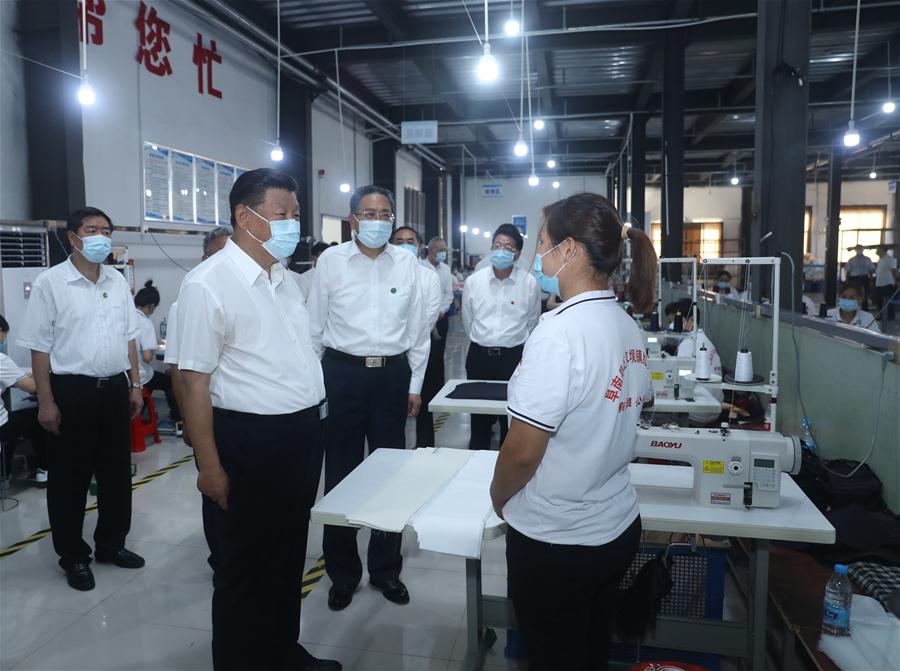 18日、阜陽市阜南県にあるカバンメーカー、紅亮箱包を訪れ、災害後の生産再開などの状況を視察する習近平氏。(阜陽=新華社記者/鞠鵬)