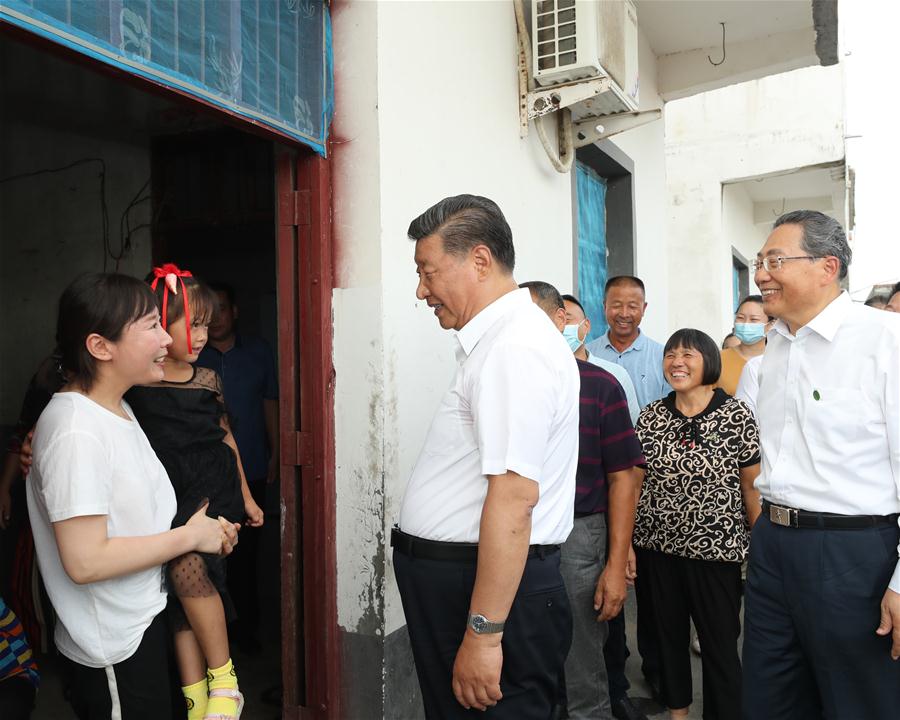 18日、阜陽市阜南県蒙窪(もうわ)遊水地の曹集鎮利民村西田坡荘台を訪れ、被災住民を見舞う習近平氏。(阜陽=新華社記者/鞠鵬)