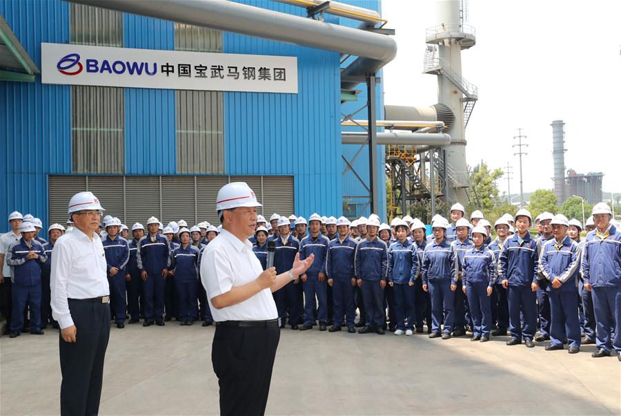 19日、中国宝武馬鋼集団を訪れ、従業員と話し合う習近平氏。(馬鞍山=新華社記者/鞠鵬)