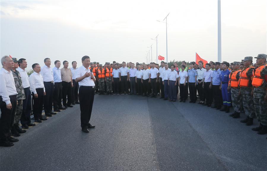 19日、肥東県の十八聯圩生態湿地遊水区の巣湖堤防で、水害防止の第一線に立った関係者や先進的、模範的な貢献をした人々の代表、災害救助に出動した解放軍、武装警察部隊の将兵をねぎらう習近平氏(中央)。(合肥=新華社記者/鞠鵬)
