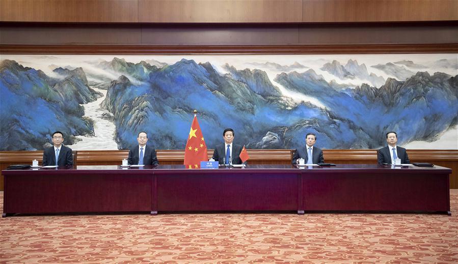 19日、北京から第5回世界議長会議に出席した栗戦書氏。(北京=新華社記者/李濤)