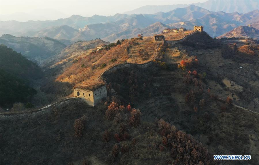 4日、河北省遷西県の楡木嶺(ゆぼくれい)長城に広がる秋の景色。(小型無人機から、唐山=新華社記者/楊世尭)