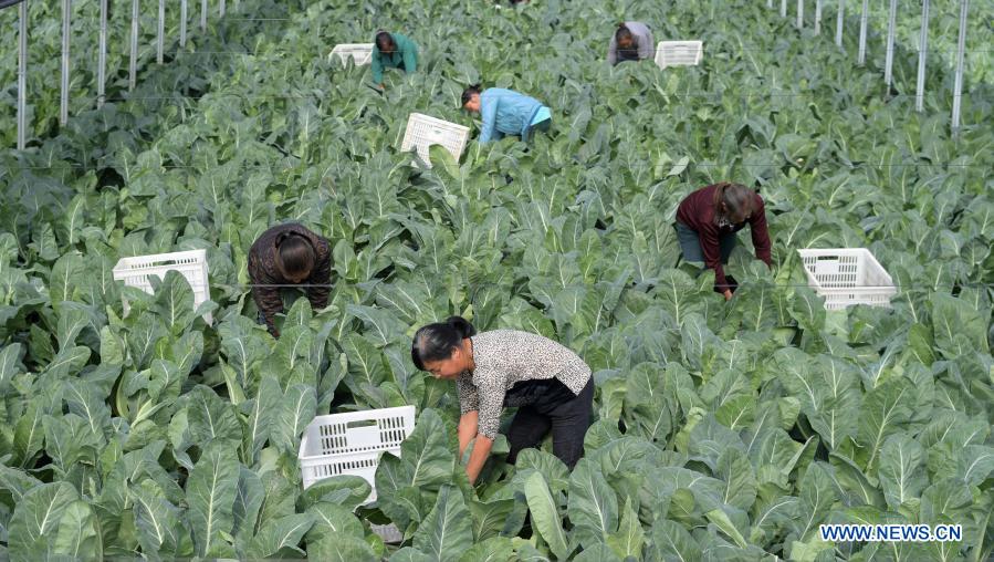 15日、銅仁市玉屏トン族自治県新店鎮洞坪村の野菜栽培基地でカリフラワーを収穫する村人。(玉屏=新華社記者/楊楹)