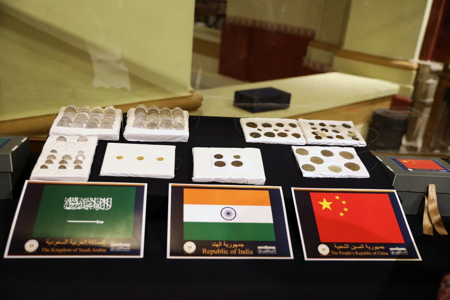 17日、返還式典で返還された(右から)中国、インド、サウジアラビアの古銭。(カイロ=新華社配信)