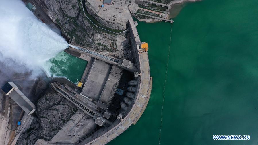青海省を流れる黄河上流にある李家峡水力発電所の放流の様子。(7月9日撮影、小型無人機から、西寧=新華社記者/呉剛)
