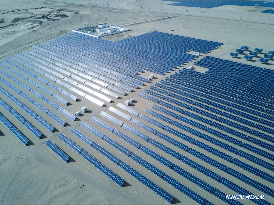 青海省海西モンゴル族チベット族自治州ゴルムド市の太陽光発電産業パークに並んだ太陽光パネル。(2017年3月23日撮影、小型無人機から、西寧=新華社記者/呉剛)