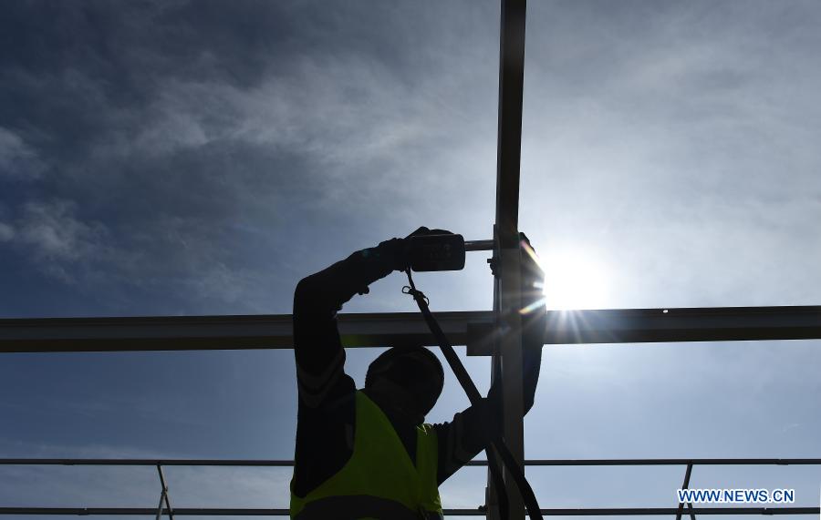 26日、青海省海南チベット族自治州共和県の太陽光発電基地の建設現場で作業する作業員。(西寧=新華社記者/張宏祥)