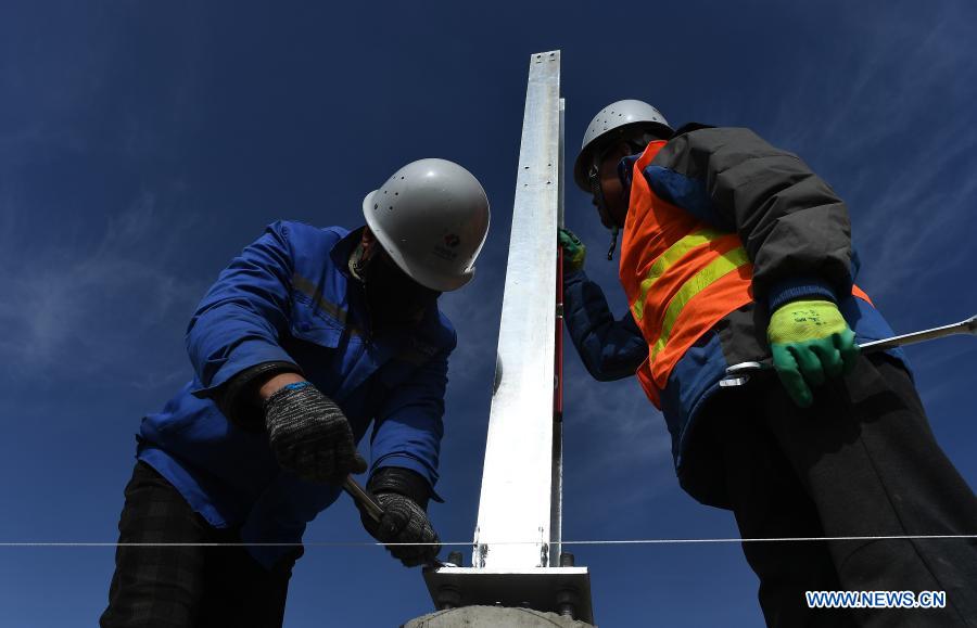 26日、青海省海南チベット族自治州共和県の太陽光発電基地の建設現場で作業する作業員。(西寧=新華社記者/張宏祥)