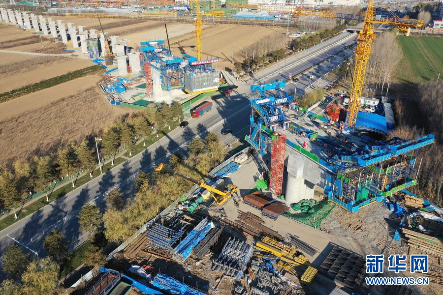 11月30日、建設が進む京唐都市間鉄道の河北省廊坊市三河区間。(小型無人機から、廊坊=新華社記者/邢広利)