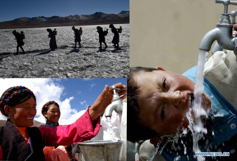 左下:チベット自治区ロカ(山南)市ゴンカル(貢嘎)県で清潔な水道水を使う住民。(資料写真)