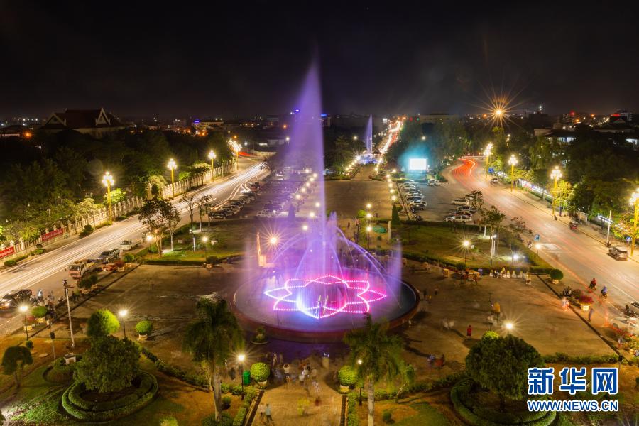 11月27日、色鮮やかにライトアップされたラオスの首都ビエンチャンのパトゥーサイ公園。(ビエンチャン=新華社配信)