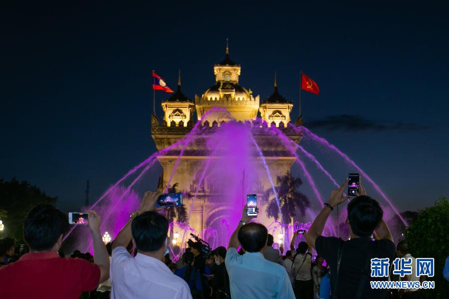 11月27日、ラオスの首都ビエンチャンのパトゥーサイ公園で、夜景を撮影する人たち。(ビエンチャン=新華社配信)