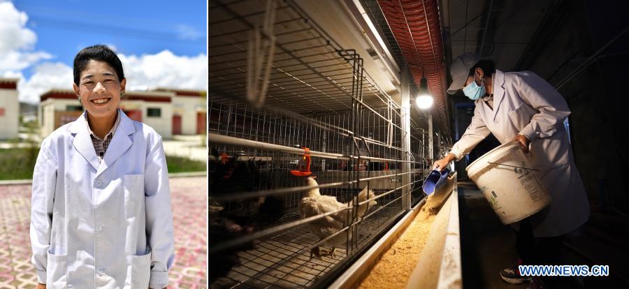 チベット自治区シガツェ(日喀則)市拉孜(ラツェ)県曲下鎮吉如村に住む卓嘎さん(左)。県内の養鶏場で働きながら4千元(約6万4千円)以上の月収を得ている(右)。(8月1日撮影、ラサ=新華社記者/詹彦)