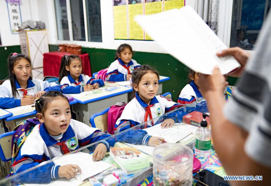 チベット自治区チャムド(昌都)市ゾガン(左貢)県東壩郷の小学校で授業を受ける児童。(9月14日撮影、ラサ=新華社記者/普布扎西)