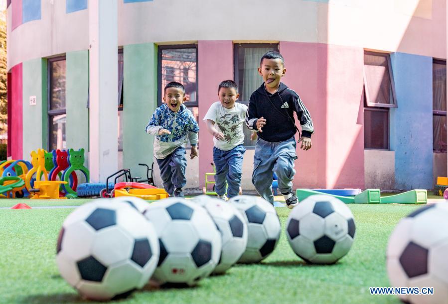 チベット自治区ラサ市にある実験幼稚園でサッカーの練習をする園児。(2019年8月22日撮影、ラサ=新華社記者/孫非)
