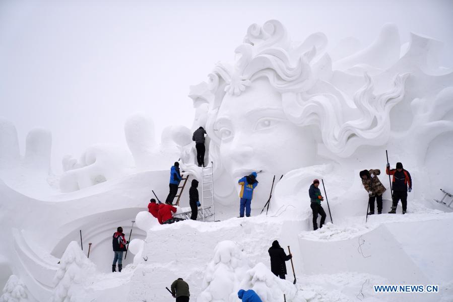 【新華社ハルビン12月12日】第33回太陽島国際雪像芸術博覧会が開かれる中国黒竜江省ハルビン市の会場では、雪像の制作が急ピッチで進められている。今月下旬の開幕を前に、準備は大詰めを迎えている。
