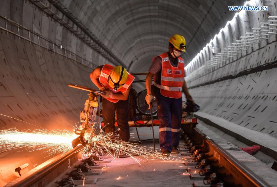 16日、広州地下鉄18号線の建設現場で働く作業員。(広州=新華社記者/劉大偉)