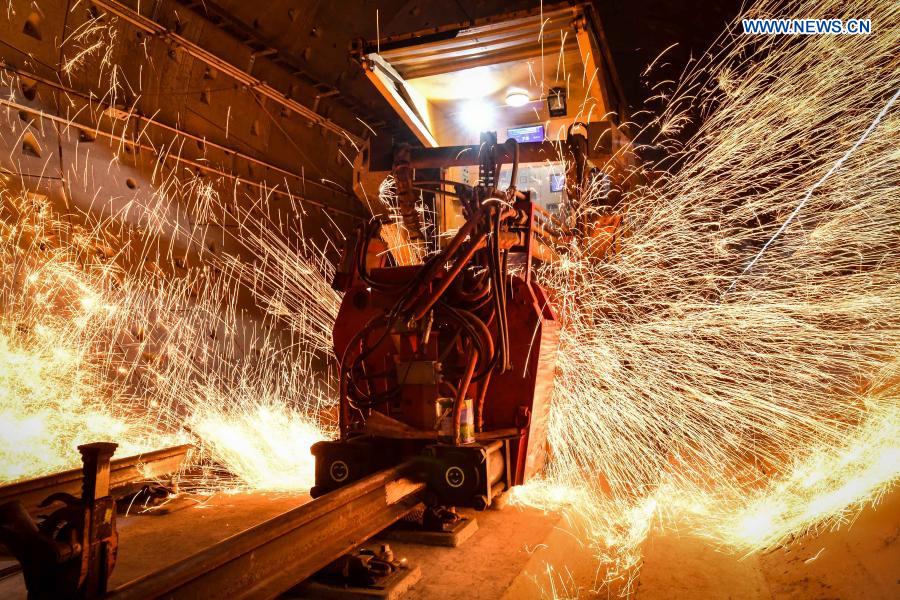 16日、広州地下鉄18号線の建設現場で、可動型フラッシュバット溶接機を使った線路工事で飛び散る火花。(広州=新華社記者/劉大偉)