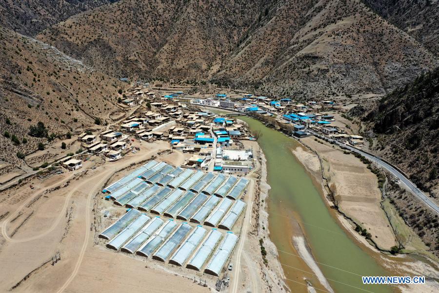 チベット自治区チャムド(昌都)市ゾガン(左貢)県の温室。(5月7日、小型無人機から撮影、ラサ=新華社記者/詹彦)