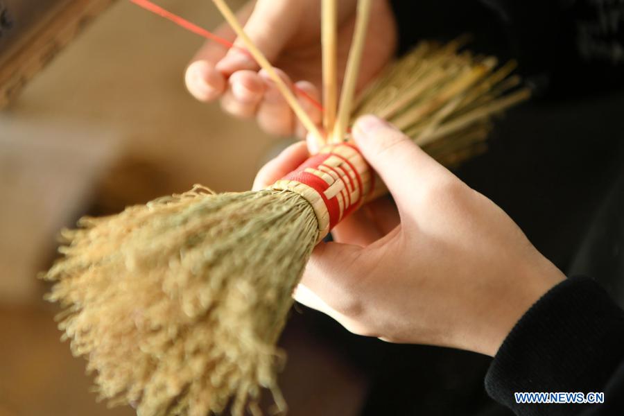 24日、ほうきを作る仇荘郷熊営村の住民。(廊坊=新華社記者/王暁)