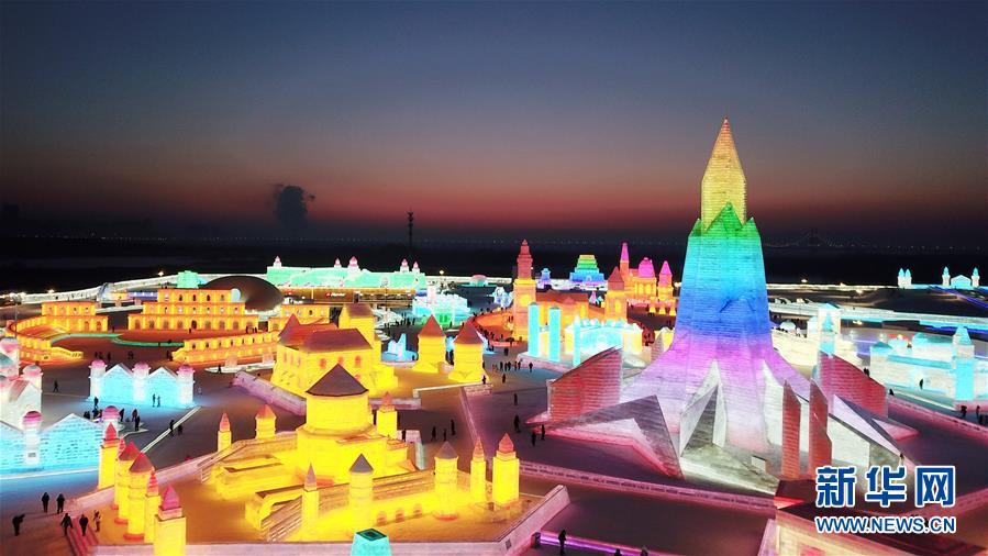 4日、ハルビン氷雪大世界の会場。(小型無人機から、ハルビン=新華社記者/王建威)